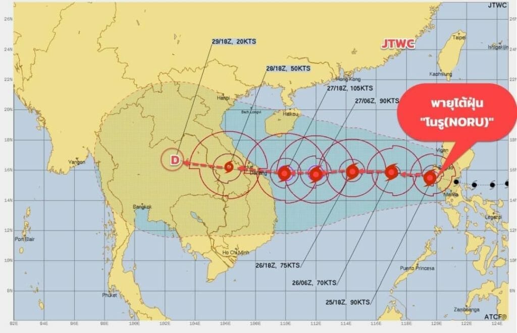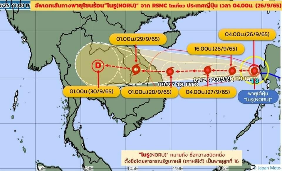 เมื่อเวลา 16.00 น. ของวันนี้ (26 ก.ย. 2565) พายุไต้ฝุ่น “โนรู” บริเวณทะเลจีนใต้ตอนกลาง มีศูนย์กลางอยู่ที่ละติจูด 15.9 องศาเหนือ ลองจิจูด 116.3 องศาตะวันออก มีความเร็วลมสูงสุดใกล้ศูนย์กลางประมาณ 120 กิโลเมตรต่อชั่วโมง พายุนี้กำลังเคลื่อนตัวทางทิศตะวันตก ด้วยความเร็วประมาณ 26 กิโลเมตรต่อชั่วโมง คาดว่าจะเคลื่อนขึ้นฝั่งประเทศเวียดนามตอนกลางในวันที่ 28 กันยายน 2565 และจะอ่อนกำลังลงเป็นพายุโซนร้อนและพายุดีเปรสชันตามลำดับ โดยจะเคลื่อนเข้าปกคลุมภาคตะวันออกเฉียงเหนือตอนกลางของประเทศไทยในวันที่ 29 กันยายน 2565 ประกอบกับมรสุมตะวันตกเฉียงใต้ที่พัดปกคลุมทะเลอันดามัน ภาคใต้ และอ่าวไทย จะมีกำลังแรงขึ้น ส่งผลทำให้ในช่วงวันที่ 28 กันยายน – 1 ตุลาคม 2565 มีฝนตกหนักหลายพื้นที่และมีฝนตกหนักมากบางแห่งกับมีลมแรงบริเวณภาคเหนือ ภาคตะวันออกเฉียงเหนือ ภาคกลางรวมทั้งกรุงเทพมหานครและปริมณฑล ภาคตะวันออก และภาคใต้ ขอให้ประชาชนในบริเวณดังกล่าวระวังอันตรายจากฝนตกหนักถึงหนักมากและฝนที่ตกสะสม ซึ่งอาจทำให้เกิดน้ำท่วมฉับพลันและน้ำป่าไหลหลาก โดยเฉพาะพื้นที่ลาดเชิงเขาใกล้ทางน้ำไหลผ่านและพื้นที่ลุ่ม สำหรับประชาชนที่อาศัยบริเวณชายฝั่งให้ระวังอันตรายจากคลื่นที่ซัดเข้าหาฝั่งไว้ด้วย