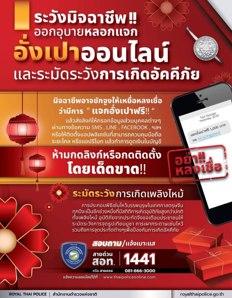 พ.ต.ท.หญิง ณพวรรณฯ กล่าวว่า ในช่วงวันที่ 20-22 มกราคม 2566 จะเป็นช่วงเทศกาลวันตรุษจีน ซึ่งเป็นวันขึ้นปีใหม่ของคนไทยเชื้อสายจีนและปัจจุบันกลุ่มโจรออนไลน์มักจะอาศัยจังหวะตามเทศกาลต่างๆ ฉวยโอกาสหลอกลวงประชาชน โดยในช่วงเทศกาลตรุษจีนนี้ มิจฉาชีพอาจชักจูงให้เหยื่อหลงเชื่อว่ามีการ “แจกอั่งเปาฟรี” แล้วส่งลิงก์เพื่อให้เรากรอกข้อมูลส่วนบุคคลต่างๆ หรืออาจจะหลอกให้ติดตั้งแอปพลิเคชันที่สามารถควบคุมมือถือระยะไกล หรือ แอปรีโมท แล้วทำการดูดเงินในบัญชี หากเราได้รับ SMS ในลักษณะดังกล่าวห้ามกดลิงก์โดยเด็ดขาด รวมถึงไม่กรอกข้อมูลส่วนตัวใดๆ กรณีมีข้อความเลขรหัสเข้าเครื่องโทรศัพท์ไม่ทราบที่มาที่ไป ห้ามเผยแพร่บุคคลอื่นทราบ หากเผลอกดลิงก์ติดตั้งแอปฯ แปลกปลอมดังกล่าว ให้รีบลบหรือรีเซต เครื่องใหม่ทันที หากโทรศัพท์ไม่ค้างหรือดับ วิธีที่ตัดทุกอย่างคือ “เปิดโหมดเครื่องบิน” หากเครื่องค้างให้ กดปุ่มเปิด-ปิดแช่ไว้ เป็นการตัดสัญญาณโทรศัพท์เครือข่ายอินเทอร์เน็ตทันที