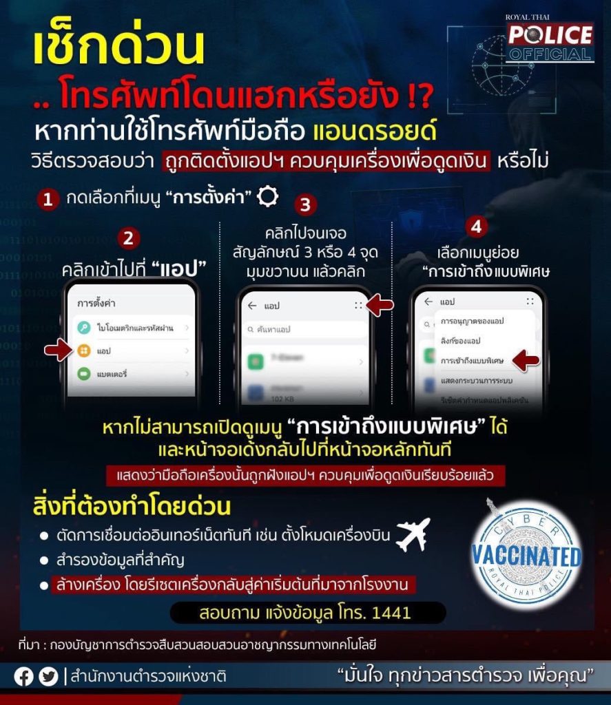ทั้งนี้หากไม่สามารถเปิดดูเมนู “การเข้าถึงแบบพิเศษ” ได้ และหน้าจอเด้งกลับไปที่หน้าจอหลักทันที แสดงว่ามือถือเครื่องนั้นถูกฝังแอปฯ ควบคุมเพื่อดูดเงินเรียบร้อยแล้ว