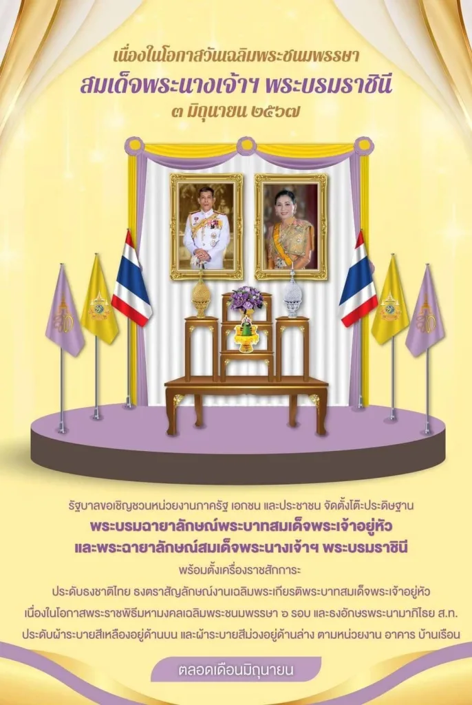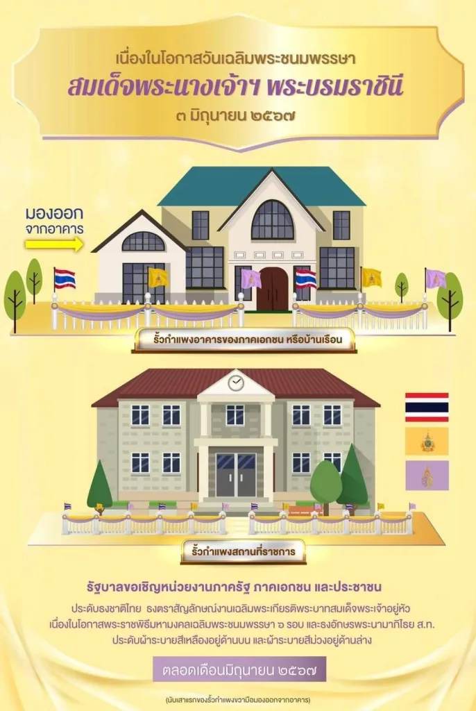 รัฐบาลขอเชิญชวน หน่วยงานภาครัฐ เอกชน และประชาชน จัดตั้งโต๊ะประดิษฐานพระบรมฉายาลักษณ์พระบาทสมเด็จพระเจ้าอยู่หัว และพระฉายาลักษณ์สมเด็จพระนางเจ้าฯ พระบรมราชินี พร้อมตั้งเครื่องราชสักการะ และจัดตกแต่งสถานที่เพิ่มเติม โดยประดับพระฉายาลักษณ์สมเด็จพระนางเจ้าฯ พระบรมราชินีร่วมกับพระบรมฉายาลักษณ์พระบาทสมเด็จพระเจ้าอยู่หัว และตราสัญลักษณ์งานเฉลิมพระเกียรติพระบาทสมเด็จพระเจ้าอยู่หัว เนื่องในโอกาสพระราชพิธีมหามงคลเฉลิมพระชนมพรรษา 6 รอบ 28 กรกฎาคม 2567 และประดับธงชาติไทยร่วมกับธงตราสัญลักษณ์ งานเฉลิมพระเกียรติพระบาทสมเด็จพระเจ้าอยู่หัว เนื่องในโอกาสพระราชพิธีมหามงคลเฉลิมพระชนมพรรษา 6 รอบ 28 กรกฎาคม 2567 และธงอักษร พระนามาภิไธย ส.ท. และประดับผ้าระบายสีเหลืองร่วมกับผ้าระบายสีม่วง ตามอาคารสถานที่ ตลอดเดือนมิุนายน