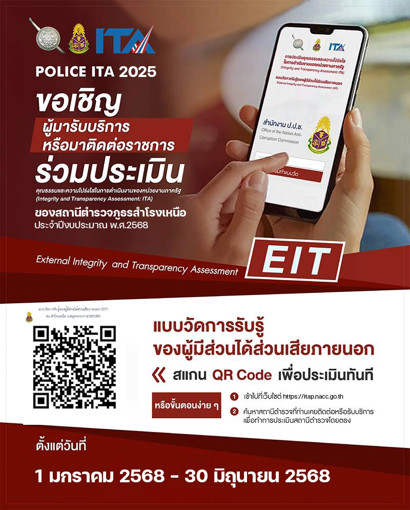 ขอเชิญชวน ผู้มารับบริการ / มาติดต่อ สถานีตำรวจ ร่วมจัดทำแบบวัดการรับรู้ของผู้มีส่วนได้ส่วนเสียภายนอก ประจำปีงบประมาณ พ.ศ.2568 (External Integrity and Transparency Assessment : EIT 2025)